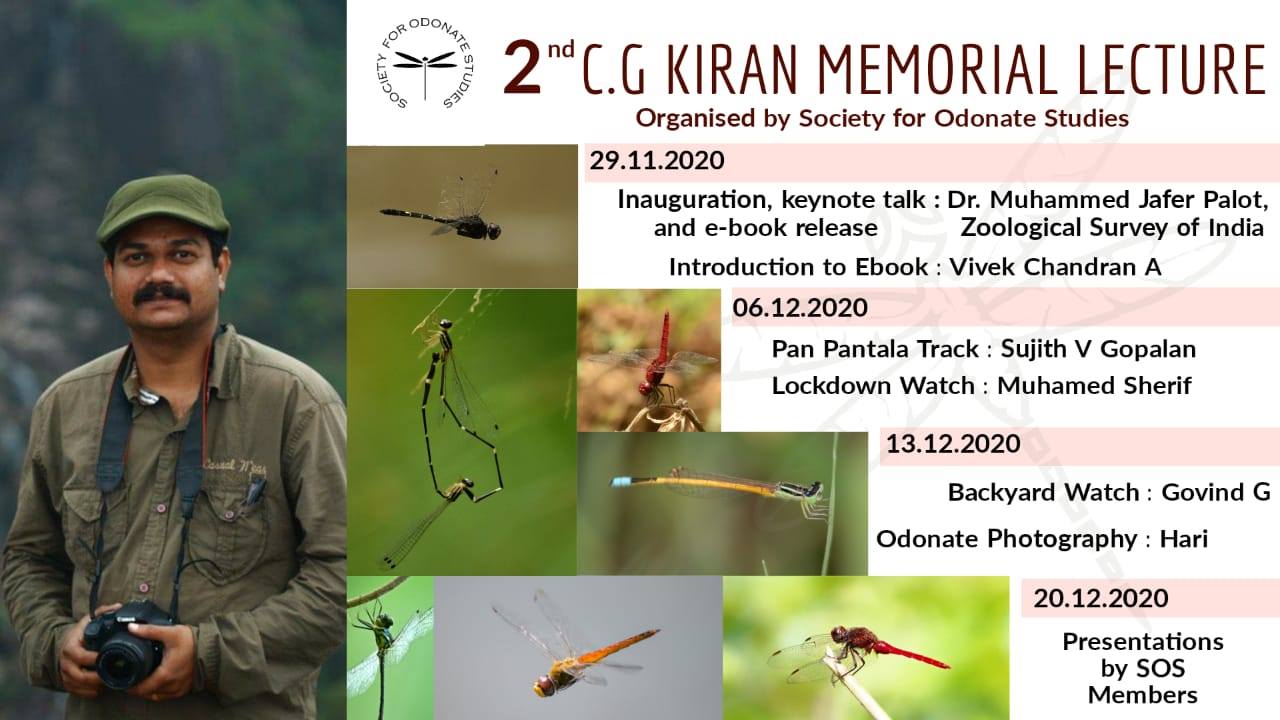 We are happy to inform you that we will be organising the 2nd C. G. Kiran Memorial Lecture on Odonata in the form of a webinar series this year. The event begins on 29/11/2020 at 6.45 PM with a key note talk by Dr. Muhammed Jafar Palot, Scientist-B, Zoological Survey of India. The much awaited 2nd version of our ebook would be launched on the same day. On the next three consecutive Sundays, we plan to have talks on various interesting topics of odonata, including selected talks of SOS members. All odonate enthusiasts are hereby invited to attend the event through facebook live in our group Dragonflies of Kerala. Let us celebrate odonates with the same enthusiasm that Kiran had for them. This is the best tribute we can offer him!