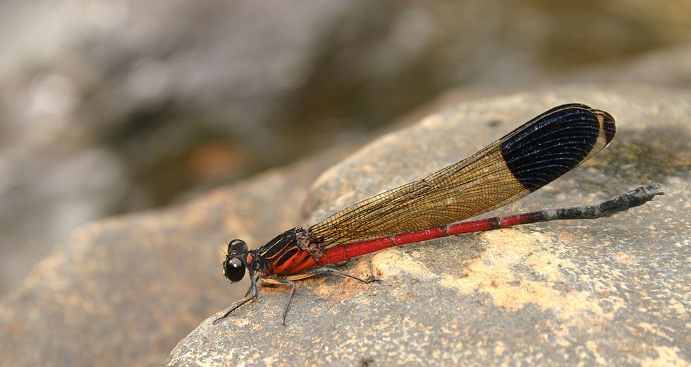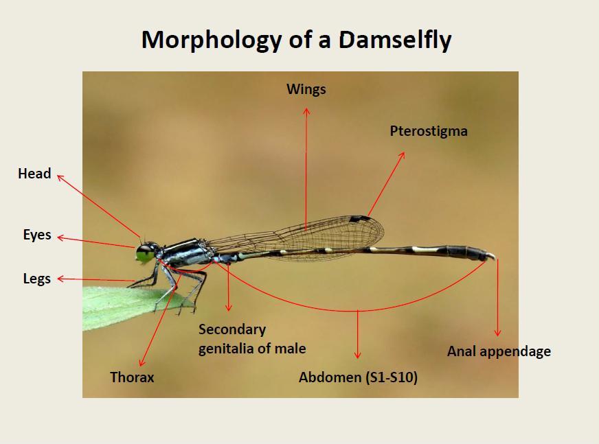 Damselflies are insects of the suborder Zygoptera in the order Odonata. They have a broad head with widely separated eyes and a slender abdomen. The fore and hind wings are similar in shape, and most species rest with their wings closed.